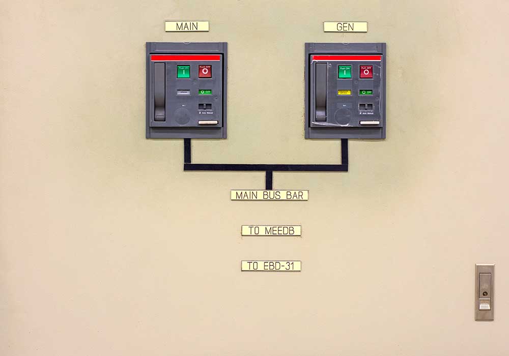 When power goes out to a building, an electrical generator is told by a transfer switch, Hey—you’re on! It then feeds power to the building’s panelboard which it then sends to external devices.